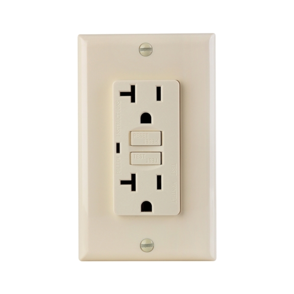 UL 943-2006 compliant. Lock out function will not allow GFCI to reset if wired incorrectly. End of life function stops voltage in the event of a GFCI component failure. 20 A/125 VAC. 8 back wiring holes and side wire screws accept up to 12 ga wire. LED status indicator, color matched wall plate and screws.